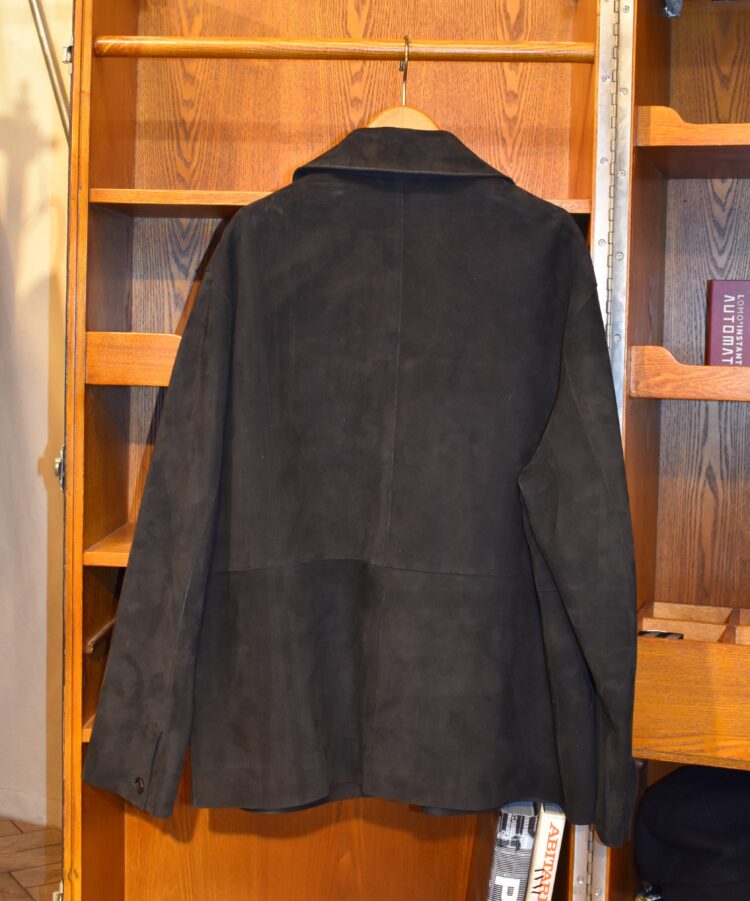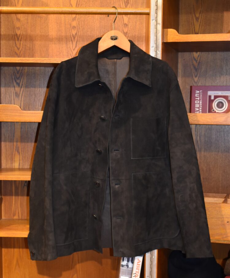 皮小物を中心に、数多くのメゾンブランドのOEMを手がける、イタリア・フィレンツェのファクトリー《デニム》社との協業で製作したこのブルゾン。スエードレザーの表情の良さはさることながら、きめ細かいステッチワーク・ミシンワークが随所に光った、リッチな雰囲気に溢れた逸品だ。フレンチワークのカバーオールがベースとなっており、ワークのタフな印象は残しつつも、「トゥモローランド」が継続的に取り組みを行っている《デニム》社の生産背景を用いて、贅沢で品のある仕上がりとなっている。