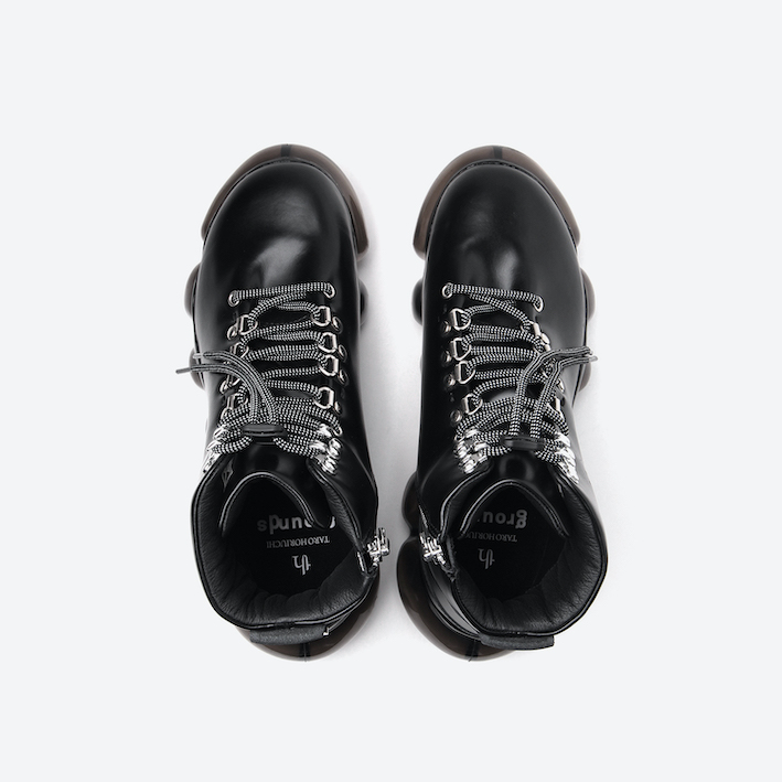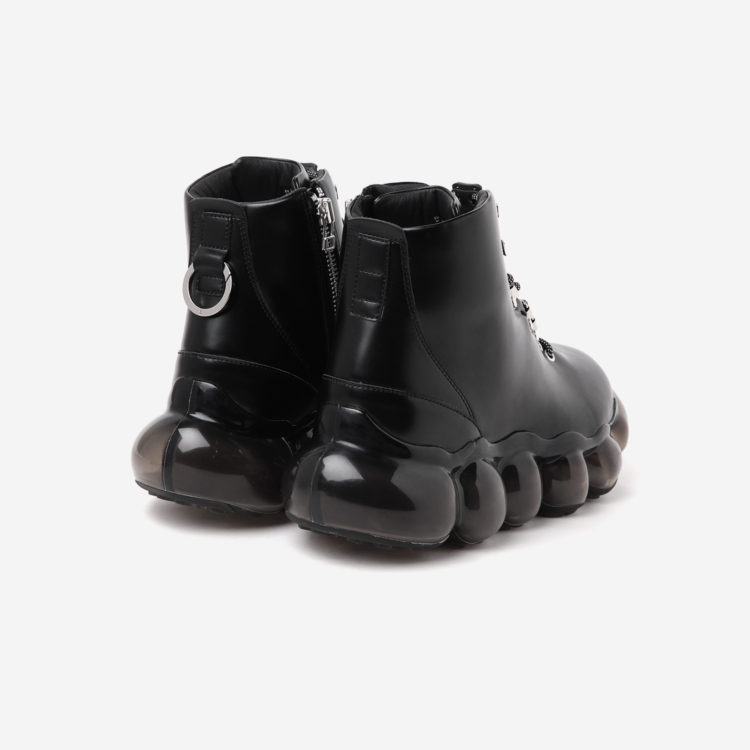 ソールに透明度が高く、柔らかい立体素材を使用することで、身体そのものが浮いたような感覚を演出する。アッパーには、マウンテンブーツのデザインを採用。着脱しやすいようにサイドはジップ仕様になっており、機能性を考慮した一足に仕上がっている。