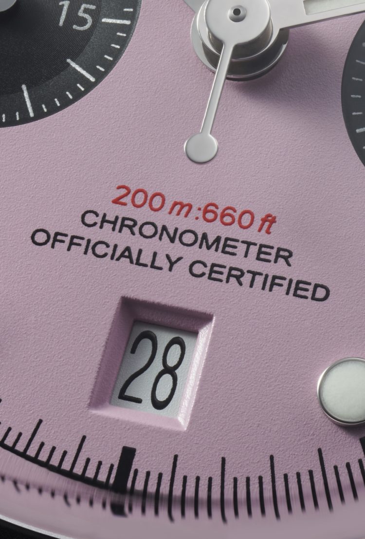 「ブラックベイ クロノ」は1969年以来《チューダー》のダイバーズウオッチのアイコンともいえる「スノーフレーク」針を採用し、ブラックのサブカウンターにドーム型のピンクダイアルを配した。初期の「チューダー クロノグラフ」に着想を得て、3時位置に45分カウンターと6時位置にカレンダー、プッシャーをデザイン。ブラックのアルマイト加工インサートにタキメーター目盛りを備えたステンレススチール製ベゼルがスポーティな外観を演出している。