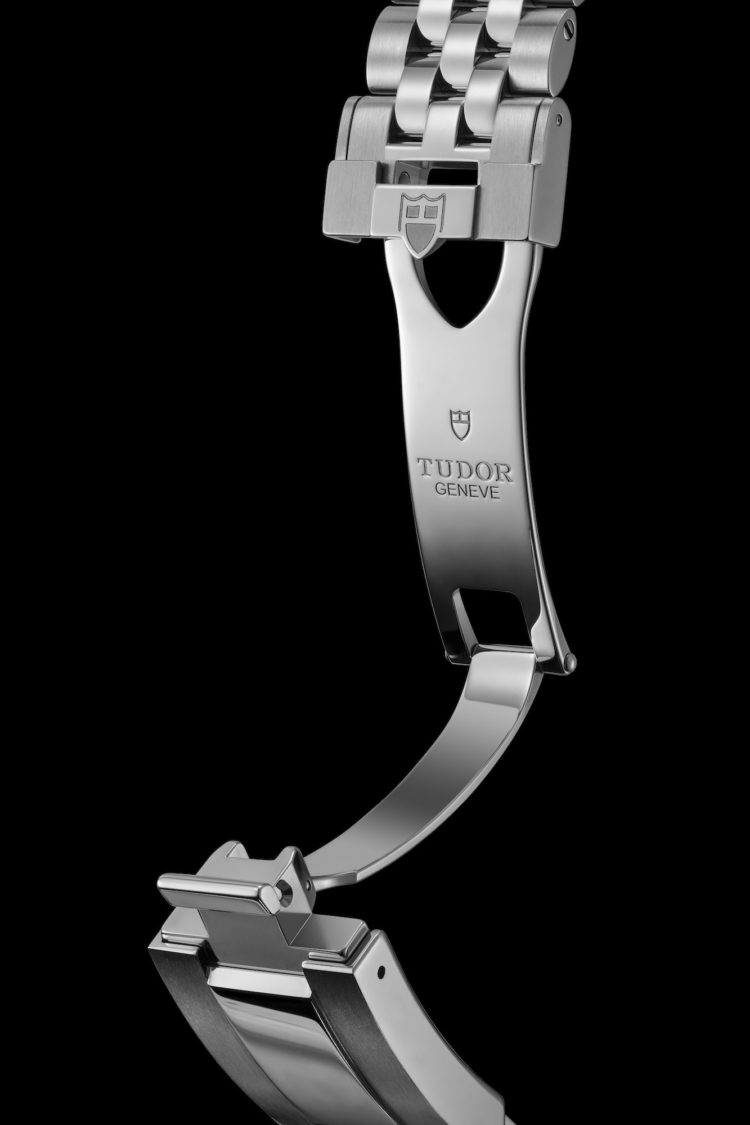 装着されるステンレススチール製5列リンクブレスレットは《チューダー》独自の“T-fit”アジャスティングシステム付きクラスプにより、工具不要で簡単に8mmの長さを5段階で調節が可能。バックルにはセラミックのボールベアリングが使われており、操作がスムーズで確実に留めることができる。