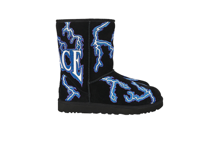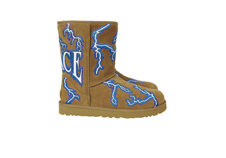 《アグ》の象徴的なクラシックショートブーツに刺繍で施された、稲妻と巨大な「PALACE」のロゴのディテールは、《パレス》の2023 年春夏コレクションのキーグラフィックで、イギリスのアーティストである Fergus Purcell(ファーガス・パーセル)が《パレス》のアーカイブからデザイン。