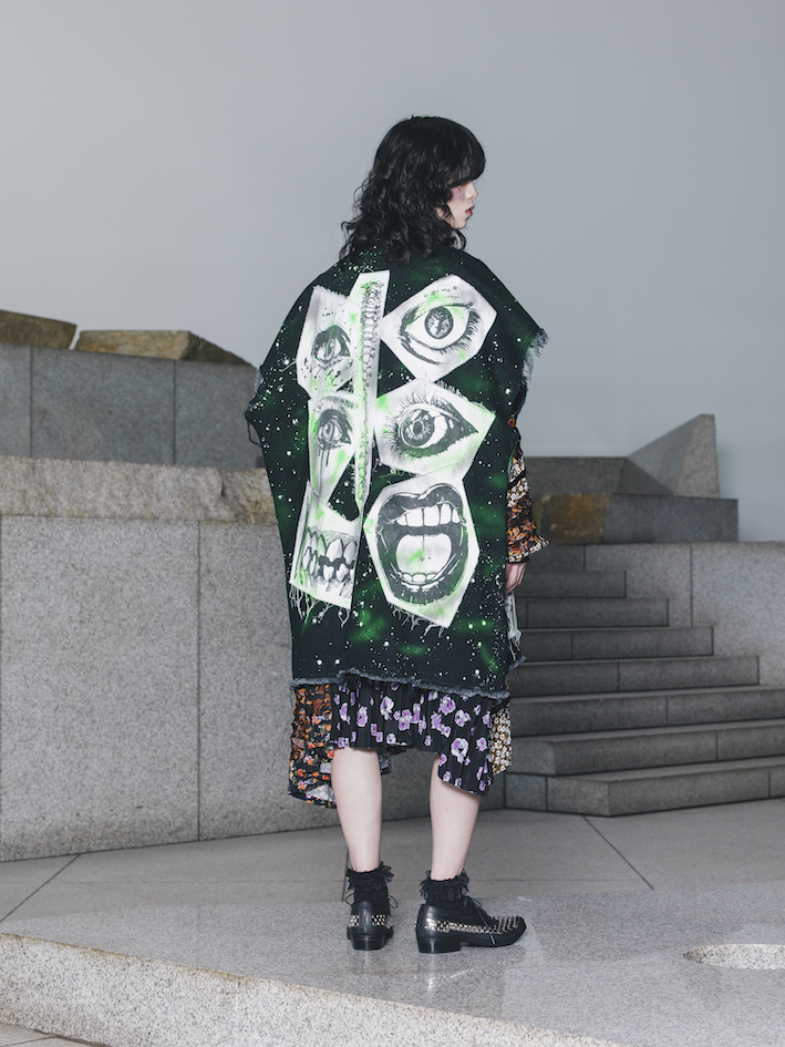 パンクの精神性である“自分を貫き通す姿勢”が好きなんです。僕が多大な影響を受けた岡本太郎も、その視点で捉えるとパンクだと思っています。彼の著書に感化されたことで、ロンドンへ行って服作りを始めましたからね。パンクカルチャーの文脈に沿うような服を作ってきましたが、ここ1、2年では精神的な意味合いとしてのパンクの意味を持つ服作りを行っています。それは、“いかに純粋に自分と向き合うか”ということだと考えていて、今回のコレクションのテーマにもしました。濁りのないクリエイションにしていきたいという思いが、パンクをテーマにし続けているのだと思っています。