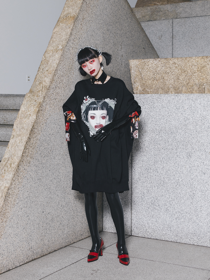 コロナの影響で発表の場がパリから東京に変化して、逆に東京だからこそ出来るフィジカルなショーをやりたいと思っていました。今回のコレクションに参加してくれたノイズバンド「非常階段」のJUNKOさんや緊縛師のHajime Kinokoさん、トレヴァーの全員が東京で活動しているアーティストでした。パリでは到底揃わないメンバーだからこそ、フィジカルでみせる価値のあるプレゼンテーションだったんです。そういう意味でもトレヴァーと一緒に制作したという意味もありましたし、以前からトレヴァーの描く少女像に対して東京的な印象を受けていました。トレヴァーの描く少女達の絵に「グロテスク」と「カワイイ」の要素が共生していることに魅了されました。無残さや異様さが、かえって可憐さを際立たせて呪縛的な力を感じます。彼の初期作品などのタッチは、ハードコアパンクの要素も感じるし、アナログ的な手法を用いた作品が多かった。その部分も《キディル》のコンセプトと重なり、彼とコラボレーションしたいと思ったんです。