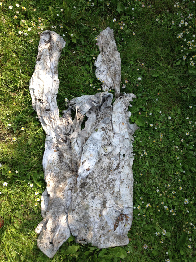 「《APRÉS》は、ゴミの山から見つけ出してきた服を新しいプロダクトにできないかと思って、何度も試行錯誤を重ねてつくりあげたものだ。発見した服は少しでも雑に扱ったらすぐに崩壊してしまうほどだったから、再構築できるよう写真を撮った上で分解するという丁寧な作業が必要だった。もともとコンテナを見つけた時には服はびしょびしょの状態だったので、その色を再現しようと、乾燥させきった服を改めて濡らしてみることも試みたんだ。とにかくいろいろな実験の末に、《APRÉS》は完成に至ったんだよ。プリントは今まで使ってこなかった現代的な技術だが、インダストリアルなものではなく、馴染みのある小さなアトリエと連携して時間をかけて行っている」