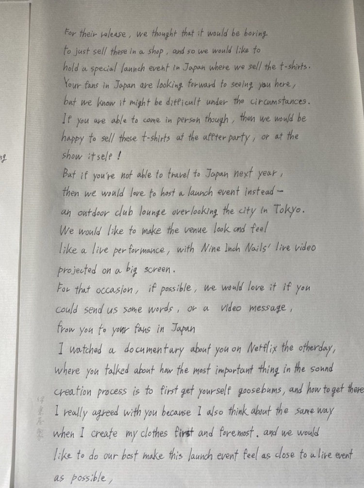 「迫村さんは以前からオアシスや、ブルース・ウェバーなどのさまざまなアーティストとのコラボレーションをやっていて、これまでも交流を続けていた人なのですが、彼は次のコラボレーションとしてNINをやりたかったらしく、一緒にアイテムを作りませんか?と2020年の7月ごろ、声をかけてくれたんです」