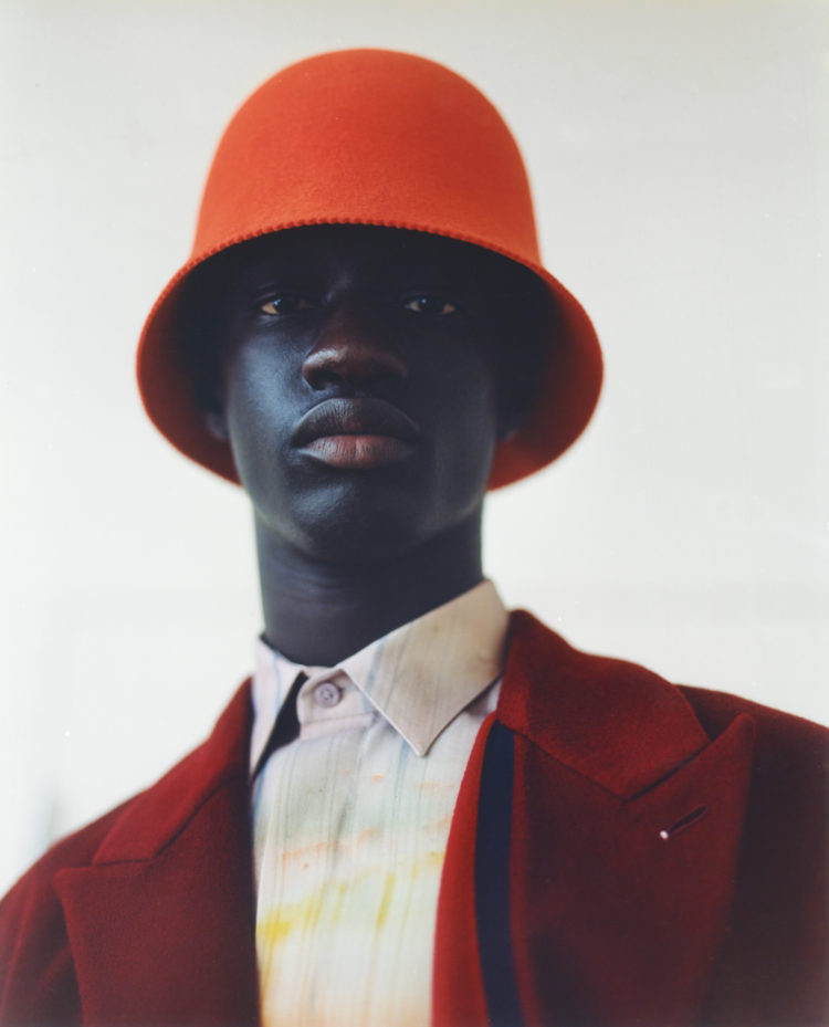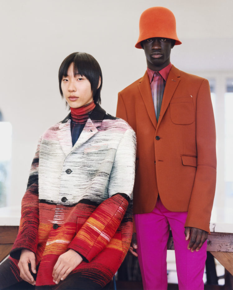 ソーシャルディスタンスを示すフロアサインを舞台美術に取り入れたプレゼンテーションには、現代アーティストであるレブ・ケージンとのコラボレーションによって制作したコレクションが登場。作品から取り入れたモチーフや色彩、テクスチャーは、脱構築的な柔らかくリラックスしたテーラリングシルエットに反映された。ダブルフェースのカシミアをふんだんに用いることで作り上げた新しいスーチングが、フォーマルウエアの伝統的なドレスコードにワークウエアやスポーツウエアのエッセンスを融合させている。パティーヌを進化させ、手作業による染めと色落ち加工で仕上げたレザージャケットや、レブの作品のプリントをそのまま取り入れたスーツも登場。ノルウェイジャンステッチをアウターやスーツに採用し、ステッチそのものが模様としてデザインされている。
