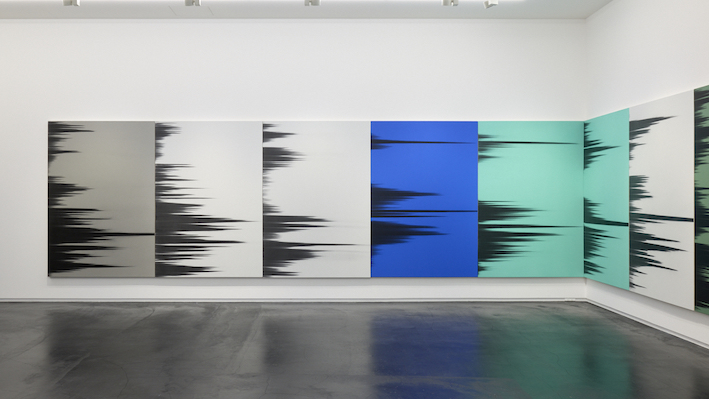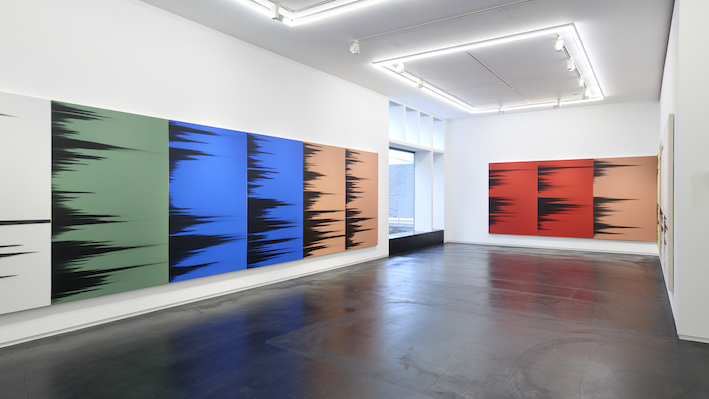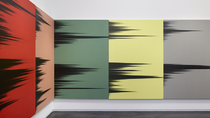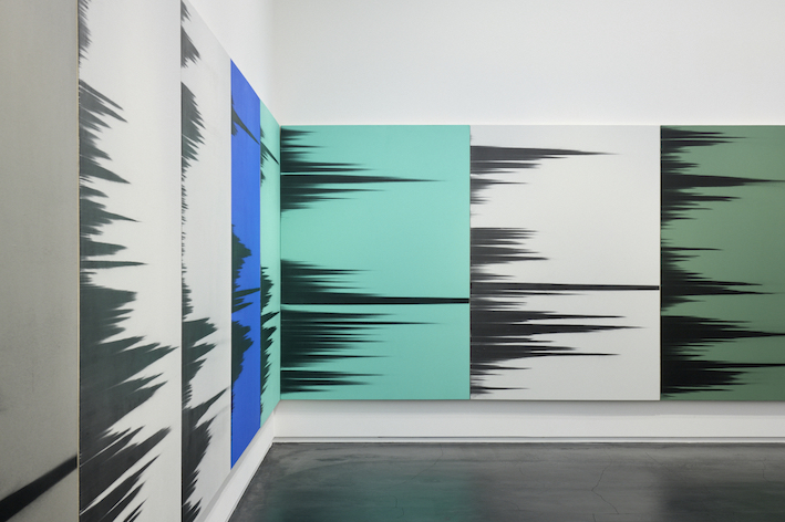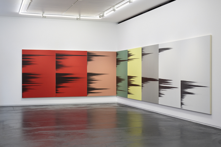 これは、私が主にニュートラルカラーで制作しているシリーズです。タカ・イシイギャラリーでの個展について考えていたとき、ウォーホルの『影』を思い出し私がやっていることとこの象徴的な作品には多くの共通点がありました。両作品は繰り返しから生まれており、私の技法は非常に異なりますがある種のリズムという点で同じ感覚があります。ウォーホルが『影』を制作したとき、彼は特定の空間をカバーするために必要な枚数のキャンバスを作り、同じイメージを何枚もの異なる背景にプリントし、空間の壁をすべて覆い尽くしました。それで私は、そのアイデアを自分のシリーズの展開に取り入れました。ウォーホルの作品と同じサイズにし、色は違えど色面の背景を用い、キャンバスの枚数はタカ・イシイギャラリーの壁をすべて覆うようにしました。これはオマージュと言えるかもしれません。あたかもウォーホルのカバーを作り、私のテクニックを使って新しい『影』を表現しているかのように。