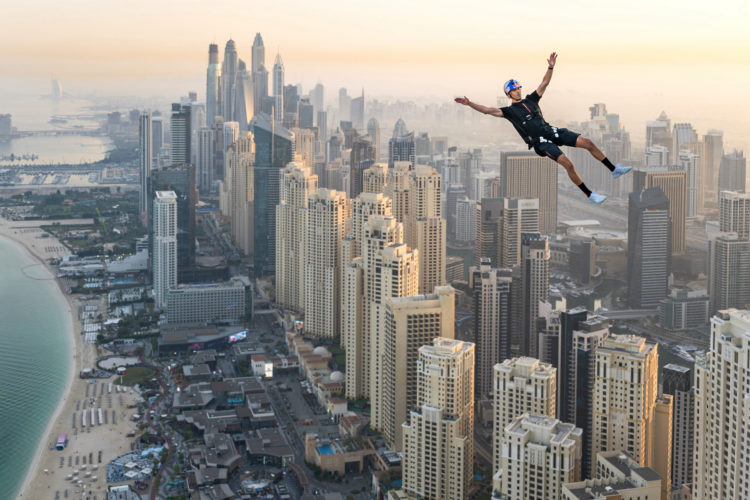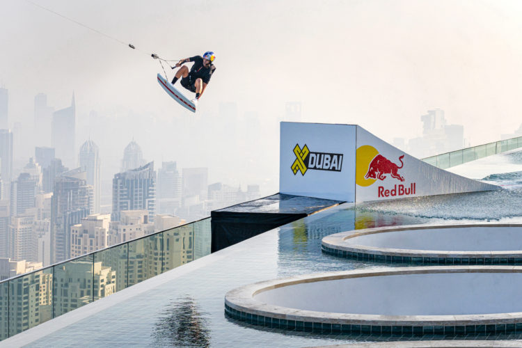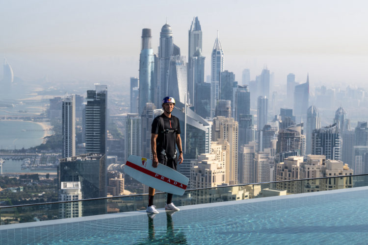 《プラダ リネア・ロッサ》がサポートするレッドブル・アスリート、ブライアン・グラブが、世界初のプロジェクトを実現させた。舞台となったのは、ドバイのアドレス・ビーチ・リゾートにある、海抜294mもの高さでギネス世界記録に認定されているインフィニティプール。今回の挑戦は、94mの幅を誇るインフィニティプールを、ドローンに牽引されながら横切るウェイクスケートから始まり、プールの縁を飛び越えて、77階建て、海抜294mからのスリリングなベースジャンプにシームレスに移行、ビーチに無事着地した。この「WakeBASE」と呼ばれる偉業は、グラブの7年越しの夢であり、まさに歴史的なマイルストーンである。