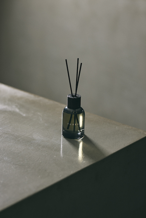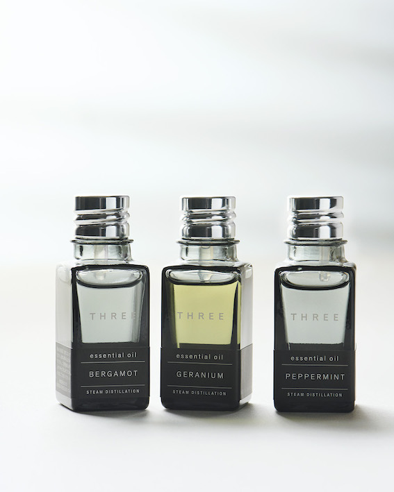 また、《THREE》のあらゆる商品に使用され、ブランドの象徴ともいえる精油(エッセンシャルオイル)も「AROMARIUM THREE」と公式オンラインショップで限定発売される。この精油には、熊本県南阿蘇の「THREEハーブガーデン」で育てたゼラニウム油など、《THREE》の高品質なオリジナル精油をはじめ、国産精油を中心に30種類も展開される。