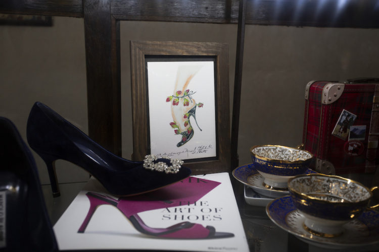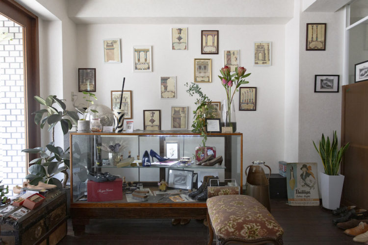 店内を見渡すと植物が多く飾られていることに気が付く。これらをアレンジしているのは、鬼塚氏と同様に若くからイギリスに魅せられてきた奥様だ。「《マノロブラニク(Manolo Blahnik)》のデザイン画には、その靴のイメージに合った植物のモチーフが描き込まれているんです。そのコンセプトを取り込んで植物を置くことにしました」